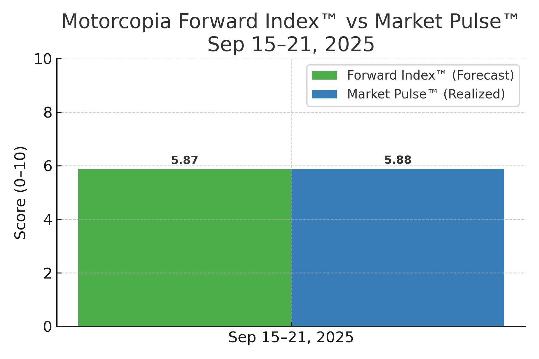 Forecast: 5.87. Reality: 5.88. For the week of Sep 15–21, Motorcopia’s Forward Index™ and Market Pulse™ lined up almost perfectly — proving the predictive accuracy of our methodology. See why this matters for collectors, advisors, and investors.