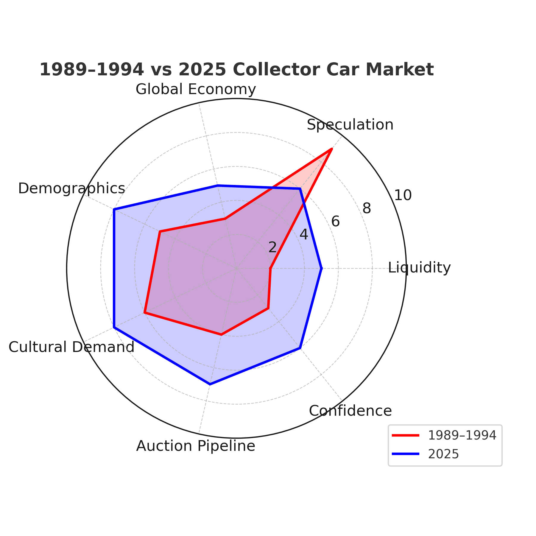 Collector cars have stumbled before — in 1989 and again in 2008 — but today’s market tells a vastly different story. See how past crashes compare to the market of 2025.